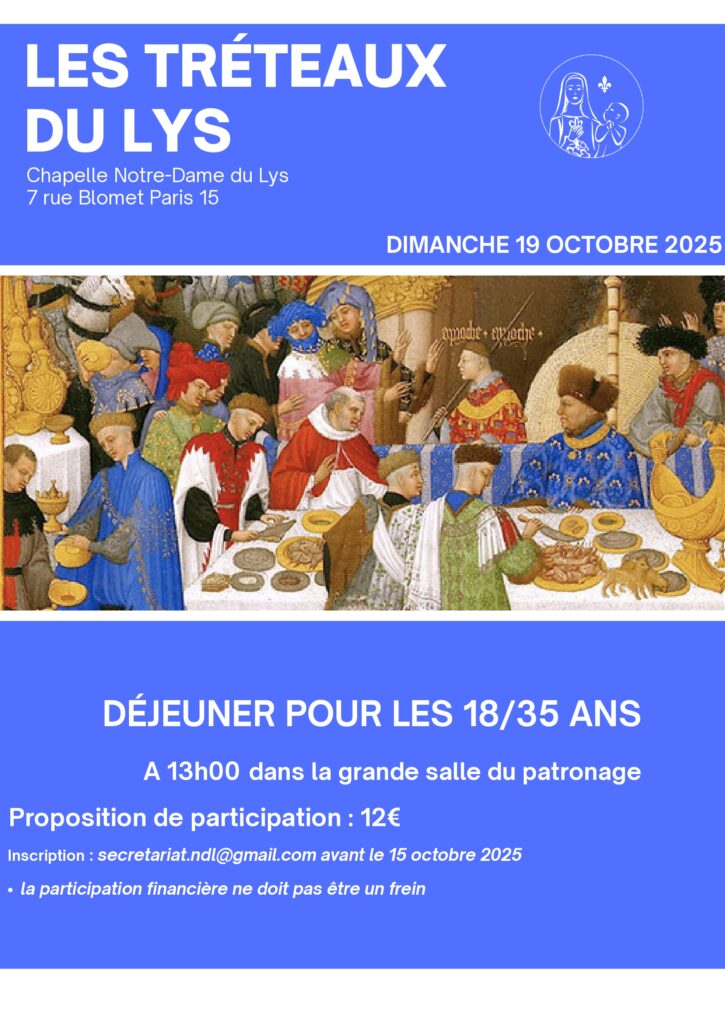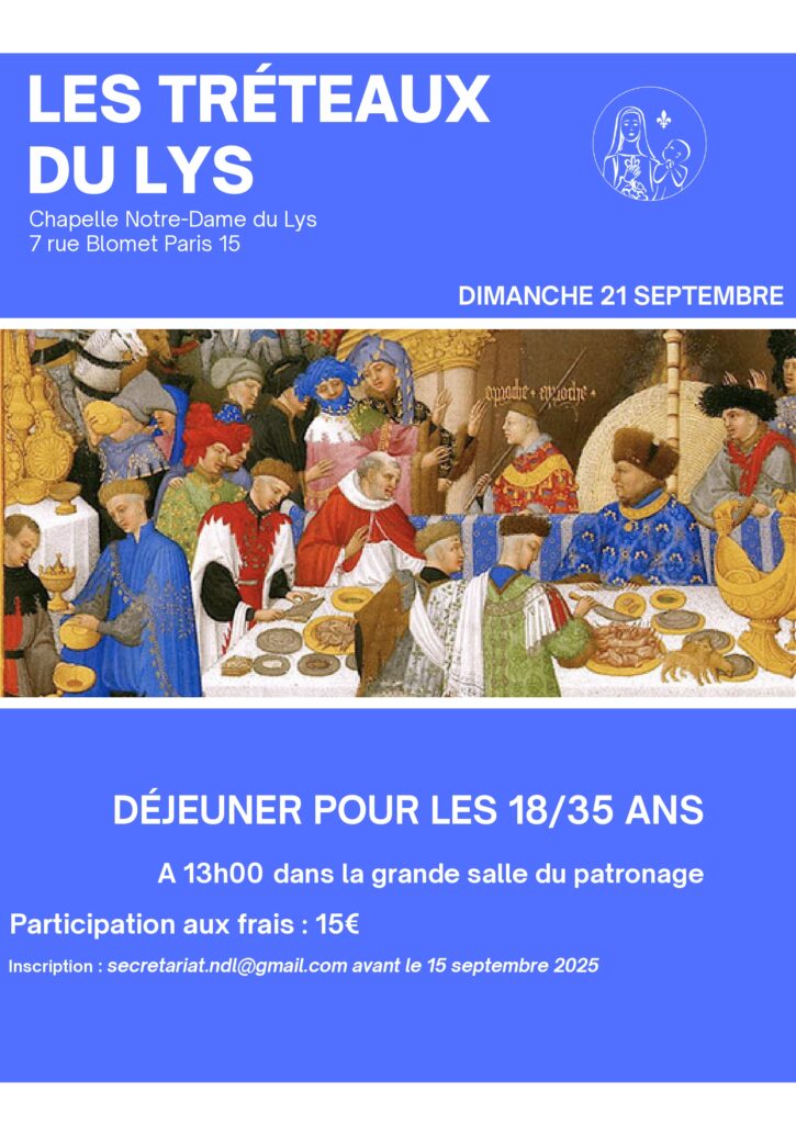 L’Abbé François SCHEFFER attend les jeunes entre 18 et 35 ans, le dimanche 21 septembre 2025 à 13h00 pour partager un bon repas. Ambiance familiale assurée ! Inscription avant le 15 septembre auprès du secrétariat : secretariat.ndl@gmail.com ou au 01 45 67 91 73.
