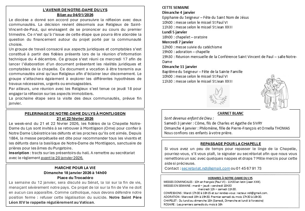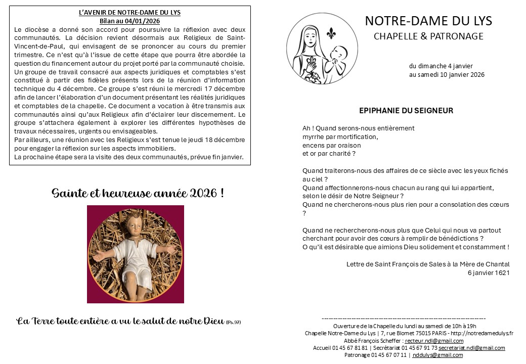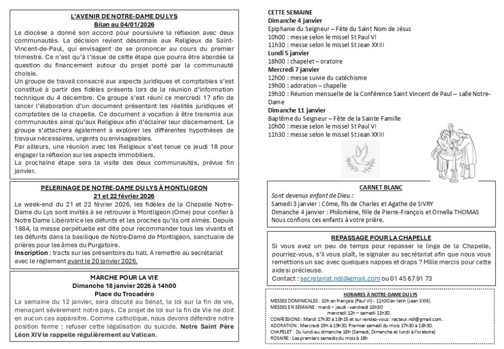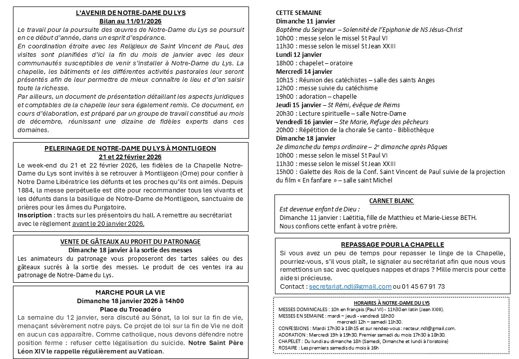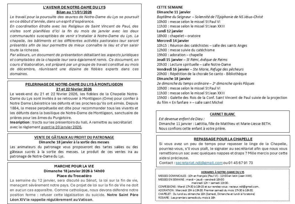 Je vous rappelle la date du mercredi 26 novembre à 20h, pour une réunion d’information avec des représentants du diocèse de Paris et des Religieux de Saint-Vincent-de-Paul concernant l’avenir de Notre-Dame du Lys. Abbé François Scheffer +