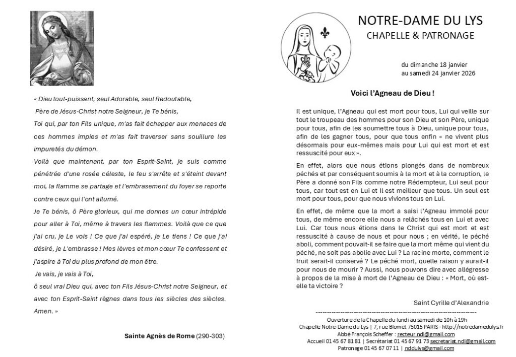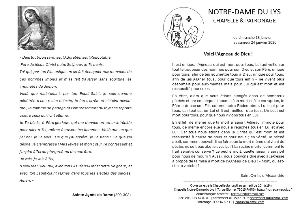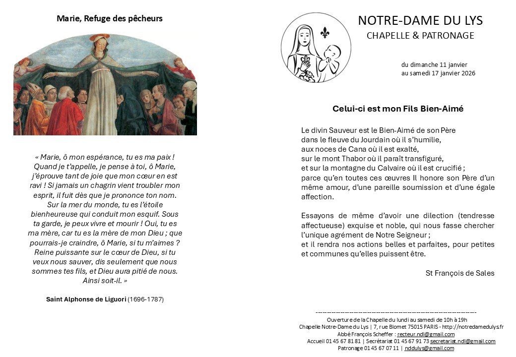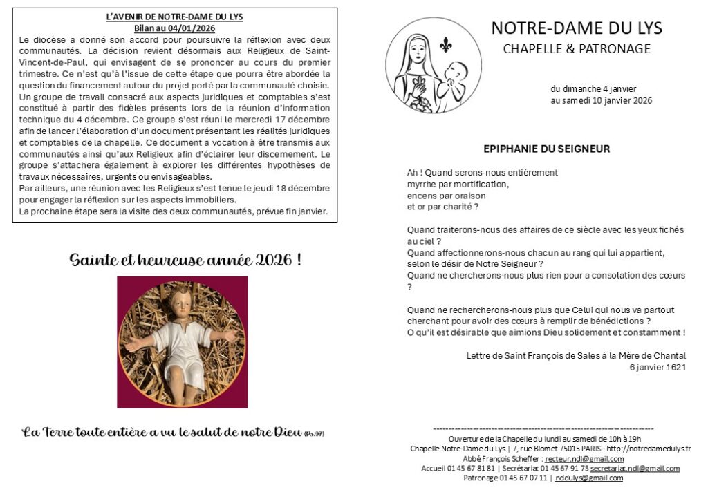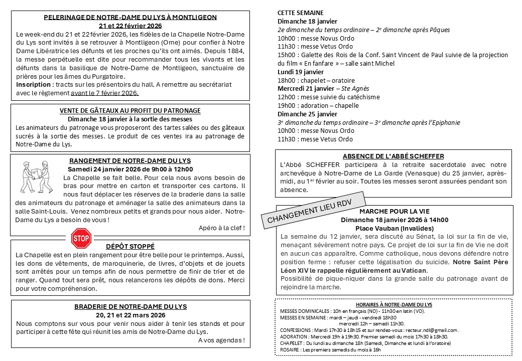 Je vous rappelle la date du mercredi 26 novembre à 20h, pour une réunion d’information avec des représentants du diocèse de Paris et des Religieux de Saint-Vincent-de-Paul concernant l’avenir de Notre-Dame du Lys. Abbé François Scheffer +